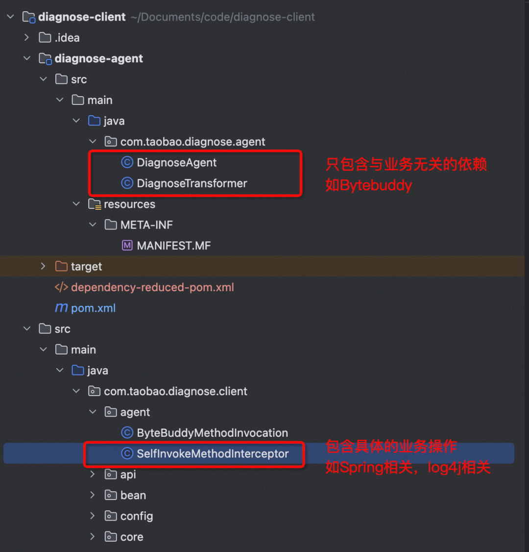 如下图,将涉及到其他依赖的 SelfInvokeMethodInterceptor 类从 diagnose-agent 包中分离出来,放入到 diagnose-client 包,并让应用依赖这个 jar 包(应用目前已经依赖了 diagnose-client)