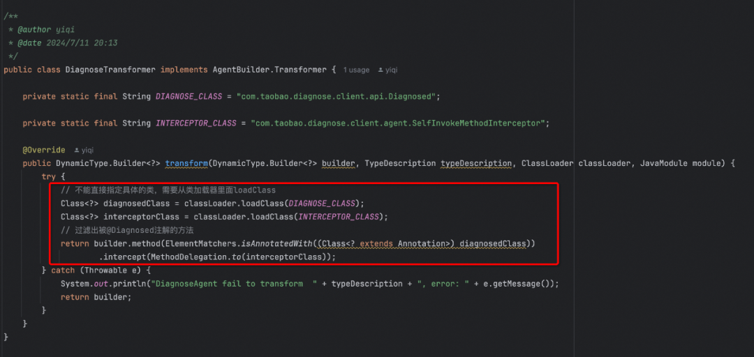 DiagnoseTransformer 需要再对方法进行一次过滤,匹配带有 @Diagnosed 注解的方法,并通过.intercept 进行方法执行的委托。我这里定义了一个 SelfInvokeMethodInterceptor,并将方法的执行委托给它。