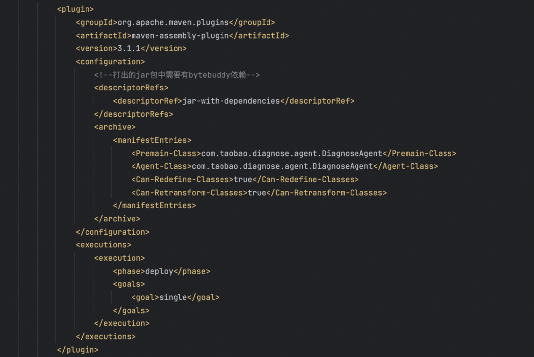 在打包时,需要注意,由于 premain 方法是在打出的 jar 包中执行的,不是在业务 jar 包中执行的。因此需要打出的 jar 包中具有相关的依赖。这里使用 “jar-with-dependencies” 的方式,将相关的依赖也打入 jar 包。