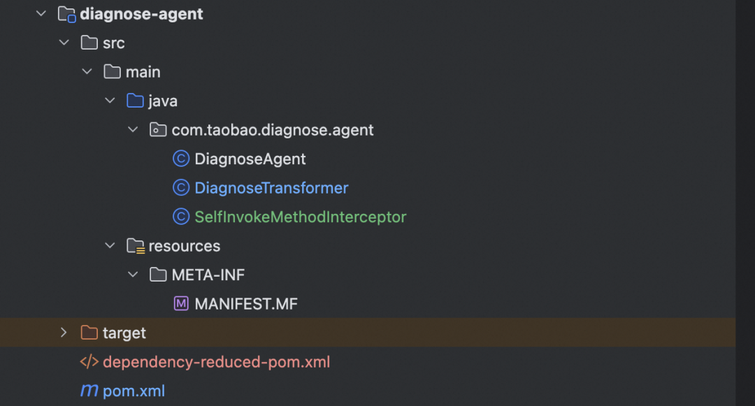 如下图,将涉及到其他依赖的 SelfInvokeMethodInterceptor 类从 diagnose-agent 包中分离出来,放入到 diagnose-client 包,并让应用依赖这个 jar 包(应用目前已经依赖了 diagnose-client)