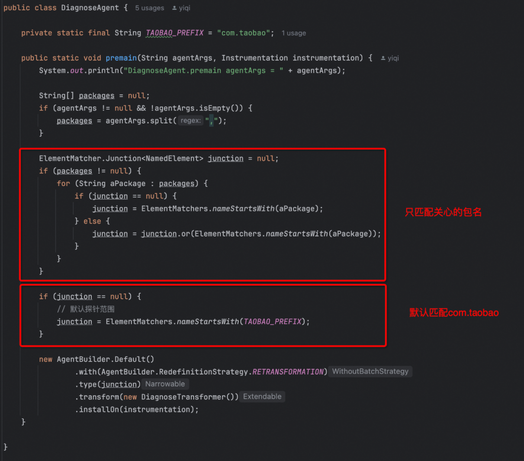 Premain 的 agentArgs 参数可以在启动时传入参数。我们可以借助这个特性,传入一些包名前缀,目的是只对我们关心的类执行后续的 transform 操作。