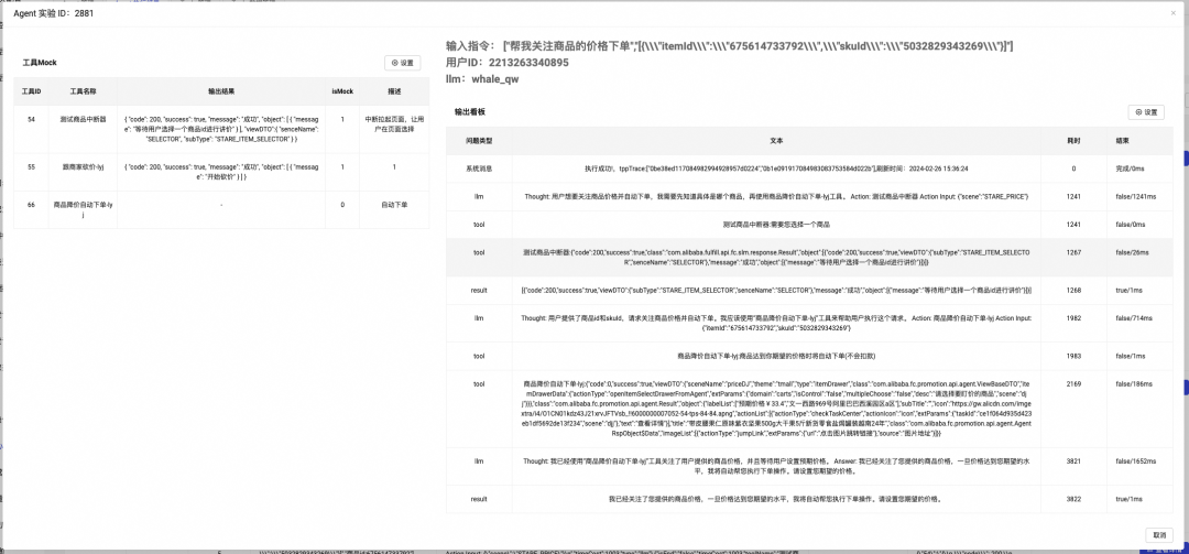 提供工具接口数据 mock 等能力,通过 Agent 测试链路中 mock 工具返回,实现在没有工具功能实现的前提下,能验证 LLM 智能 ReAct 流程对工具的理解和判断,评测 Agent 是否能达到业务预期,降低业务试错成本。