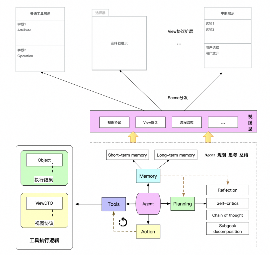 为了解决 LLM 输出非结构化数据到端上展示的问题,我们根据工具实现功能的特性和页面交互特征不同,把工具分类抽象和分别建模(具体可见 4 - 工具类型与定义),根据工具类型与端上约定特定协议,同时把工具的返回做区分,工具返回定义了 Object(给 LLM 消费的内容)和 ViewDTO(app 端消费数据结构)两个数据结构,在 Agent 侧做数据解析,把 Object 内容输入给 LLM 做下次 ReAct 推演,同时把 ViewDTO 输出到端上展示。在定义工具的展示协议,也抽象化定义了工具异常、模型中断、用户选择等交互模式,实现整体的用户交互方案,详见下图。