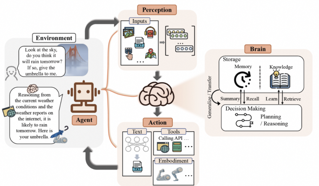 当一个人问 Agent 是否会下雨时,感知模块将指令转换为 LLM 可以理解的表示。