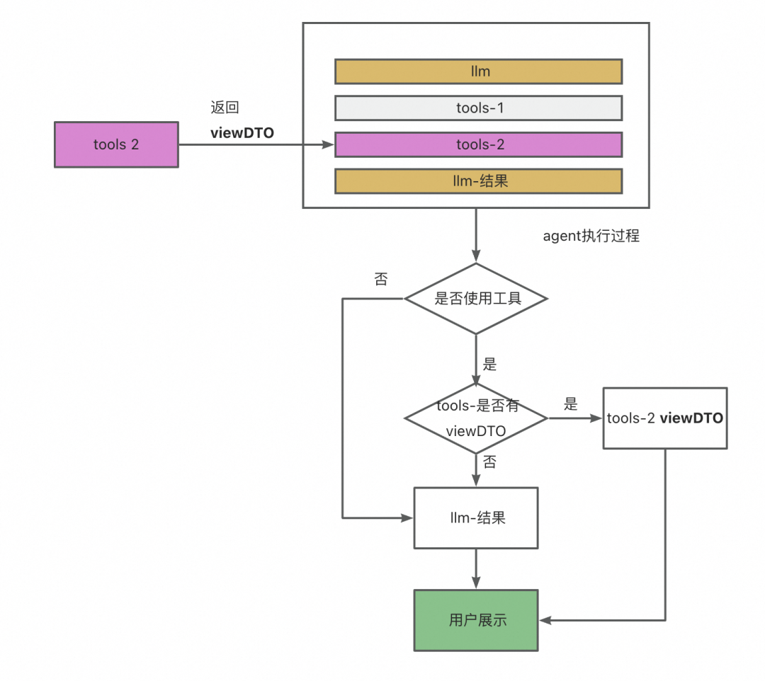 如果流程使用工具,会解析整个思维链中最后一个工具的返回结果,判断是否有给端上的展示数据结构 viewDTO,