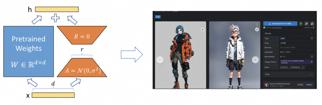 在说 NLP 领域的的 fine-tuning 之前,我们可以先说说文生图领域的 fine-tuning。目前文生图领域有个非常火的网站叫 C 站。他上面全是基于 LORA 的思路 (可参考论文 LORA) 做微调模型。基本拿 SD 的基础模型,再加上微调模型和 Promot 很容易就能生成对应风格的图片。
