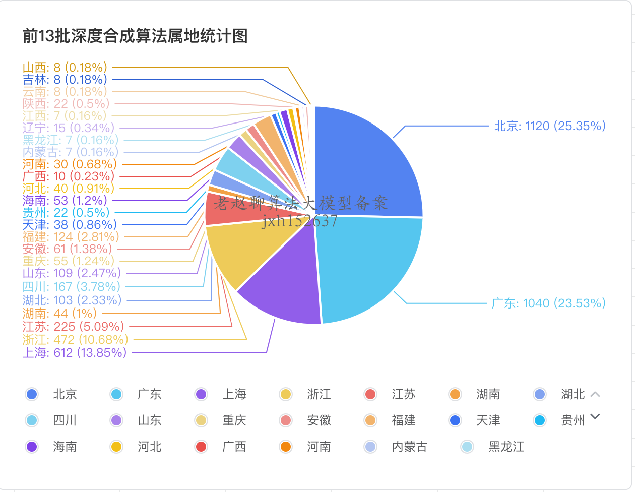 截止到9月份,国家网信办宫公布13批深度合成算法,总计通过4420 项深度合成备案,其中北京市共通过1120项,占比25.35%;紧随其后是广州省共通过1040项,占比23.53%;上海排名第三,共通过612项,占比13.85%;浙江472项,占比10.68%;四省市共占比73.41%。第十三批广东省共通过176项,远超北京市的110项,其次浙江省共同62项,上海市通过58项,江苏省通过36项。由此可见,发达地区通过率基本占全国80%左右。
