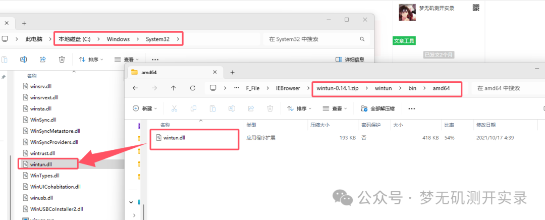 (现在的 windows 系统电脑一般是 amd64),把 wintun.dll