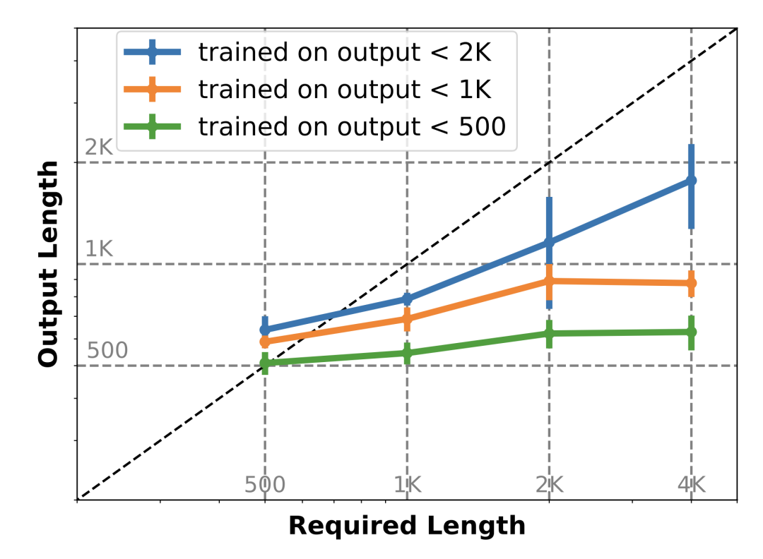 伴随着要求长度的增加,不同数据集 SFT 微调出来的模型,存在最大输出长度限制。