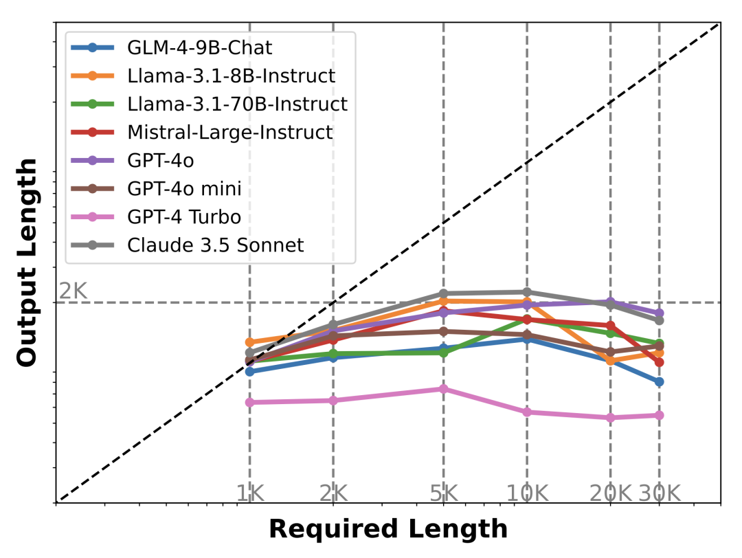 更具体来说,在 [2k, 4k) 范围内当前的模型通常表现不佳,只有 Claude 3.5 Sonnet 得分尚可;而在 [4k, 20k) 范围里,几乎所有当前的模型都完全无法达到目标输出长度,甚至得分为 0(意味着所有输出长度均小于要求长度的 1/3)。