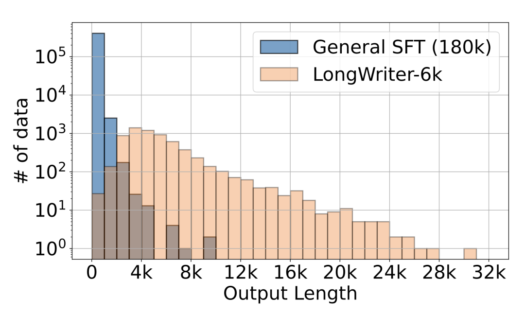 在模型训练中,为了确保模型的通用能力,我们将 LongWriter-6k 与通用 SFT 数据(180k 条数据)结合,形成整个训练集。输出长度分布如下: