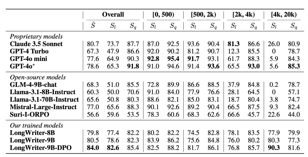 我们在 LongBench-Write 上对 4 个专有模型和 5 个开源模型进行了评测,如下表所示: