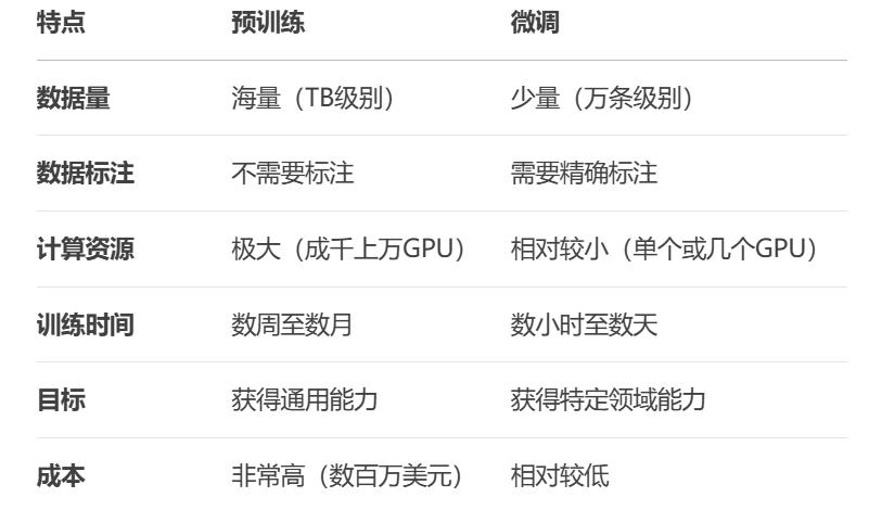 💡 前者通常需要大规模的计算资源,而后者则更多关注如何通过少量数据高效地调整模型。