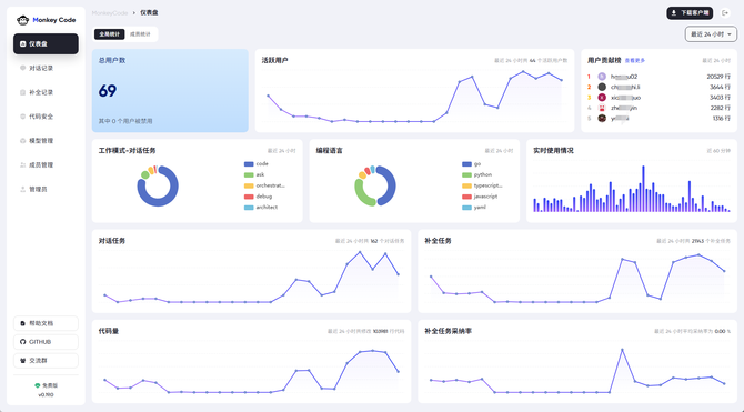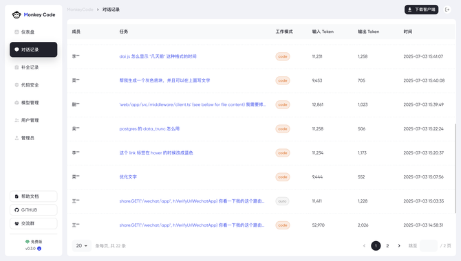 还有,上面说好的安全呢?首先,我们来看看MonkeyCode的管理面板,所有使用AI进行辅助编程的行为,以及AI生成的代码,都会详细记录在后台用户查询和审计,确保开发过程可视可控可追溯。