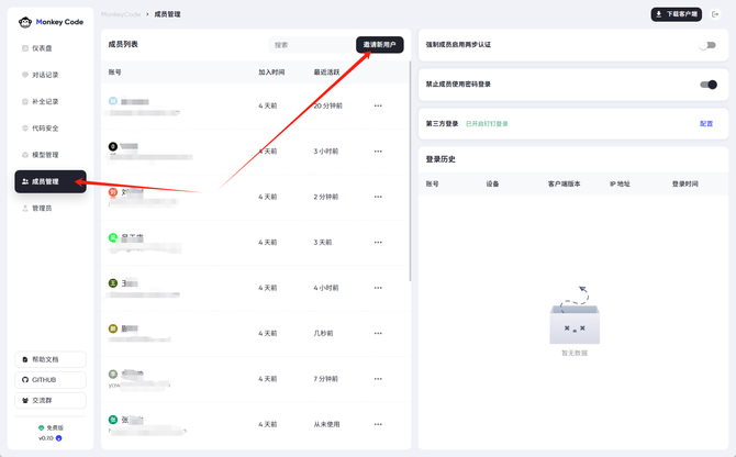 然后,进入 “成员管理”页面,点击 “邀请新用户”,平台会为每个用户生成独立的“邀请链接”。
