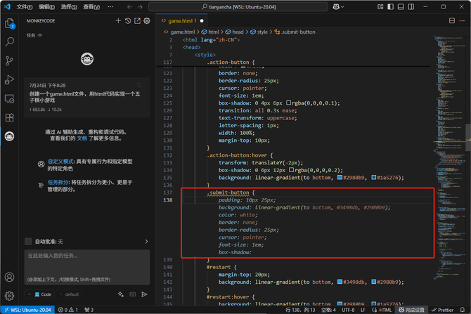 至此,五子棋小游戏完成。仅需要输入两次提示词,耗时20秒。这就是使用 MonkeyCode进行对话式编程的高效感受。