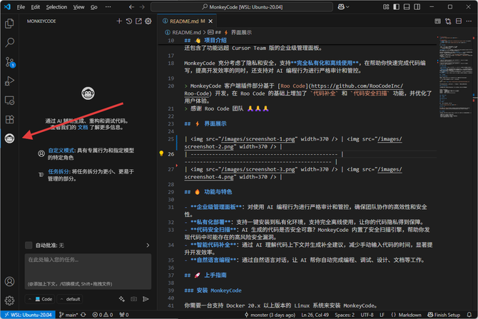 安装成功后,可以在左侧看到MonkeyCode图标,点击这个图标就可以看到 MonkeyCode的使用界面了。