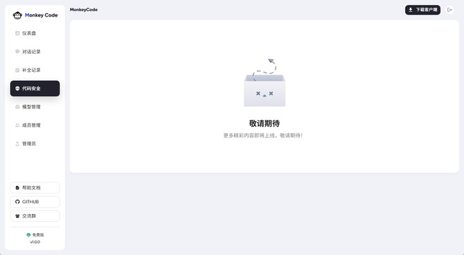 不仅如此,在后台管理面板我们还可以看到一个“代码安全”的菜单,这就是长亭科技的拿手好戏了,虽然写着 “敬请期待”,但长亭科技紧接着会在后续版本中集成代码安全扫描引擎,帮助用户发现代码中可能存在的高风险安全漏洞,让AI生成的代码不再有“幻觉”,每一行代码都得到严格管控。