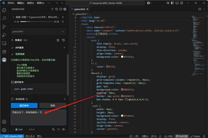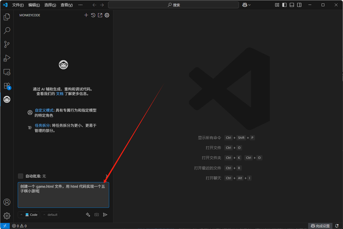 现在,我们来让MonkeyCode写一个网页版的五子棋小游戏。