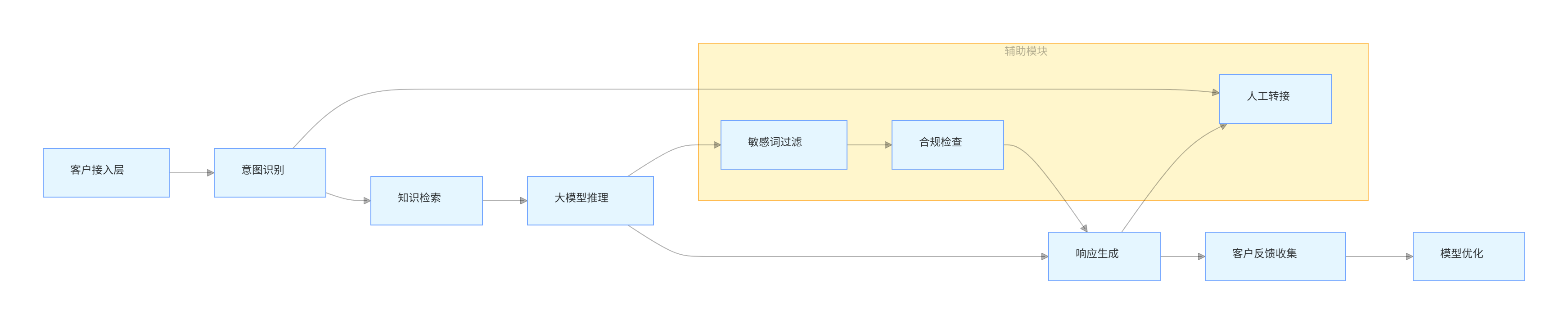 flowchart LR A[客户接入层] --> B[意图识别] B --> C[知识检索] C --> D[大模型推理] D --> E[响应生成] E --> F[客户反馈收集] F --> G[模型优化] subgraph 辅助模块 H[敏感词过滤] I[合规检查] J[人工转接] end D --> H --> I --> E B --> J E --> J