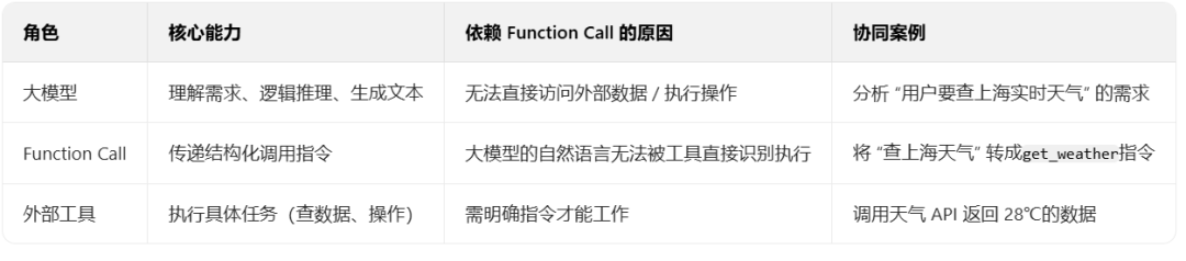而 Function Call 恰好解决了这两个局限,它是大模型的 “手脚”—— 让大脑的 “想法” 落地为 “行动”。