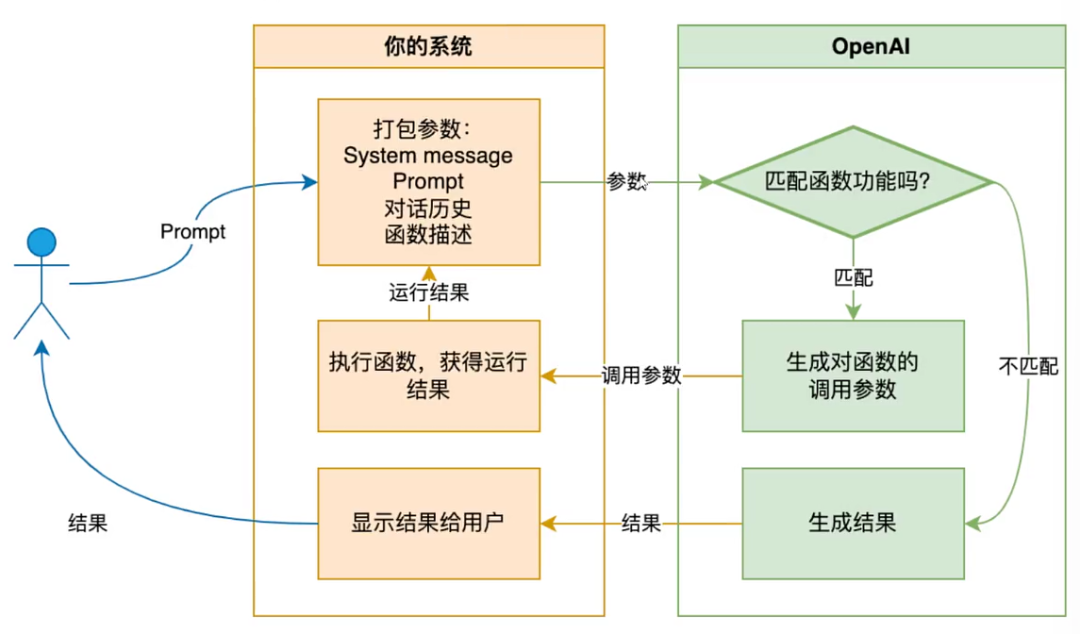 大模型本身无法直接操作数据库、调用 API、控制硬件,但通过 Function Call,它能完成 “需求→指令→结果→回答” 的闭环: