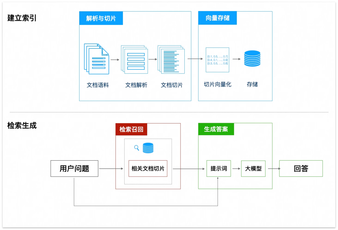 知识库大多是非结构化的文本信息,最终以向量数据格式存储,在用户提问时从向量存储中检索到与用户提问相关联的知识片段,提供给大模型,检索召回的过程,可以通过编码也可以通过另外一个大模型去实现;