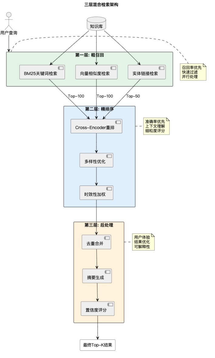 **混合检索(Hybrid Retrieval):**结合向量和关键词的优势,通过加权融合获得最佳效果。研究表明,混合检索比单一方法的性能提升25-30%。