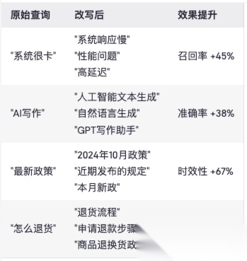 - **查询改写:**对模糊查询进行多次改写,提高召回率。“系统很卡"可以改写为"系统响应慢”、“性能问题”、"延迟高"等。