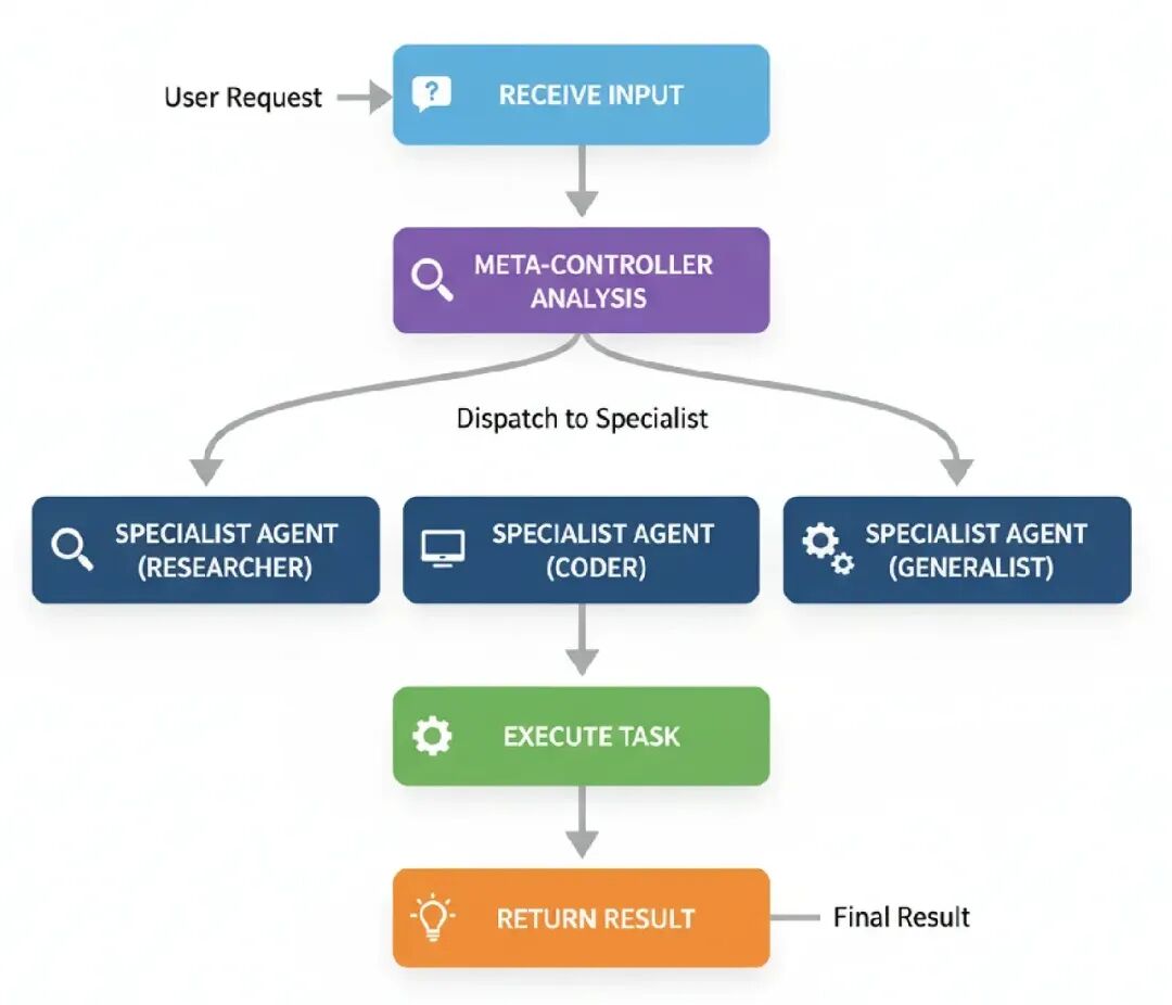 - Contextual Recall: 用户请求先击中一个Reflexive Metacognitive代理验证它在范围内,不是高风险法律或敏感查询。一个Meta-Controller然后路由任务到“Competitive Analysis”工作流程。同时,Episodic + Semantic Memory被查询表面这个竞争者的先前分析,提供立即、个性化的上下文。