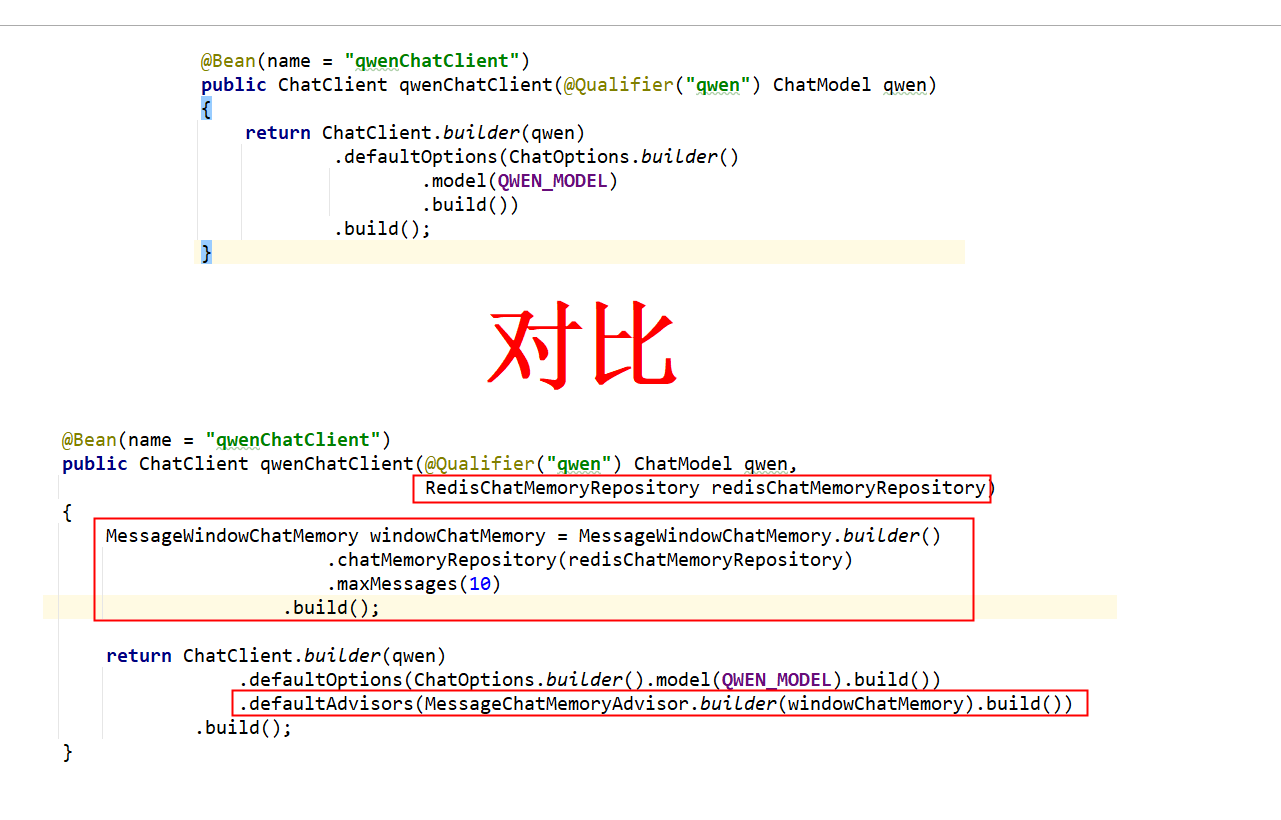 public ChatClient qwenChatClient(@Qualifier("qwen")ChatModel qwen, RedisChatMemoryRepository redisChatMemoryRepository){