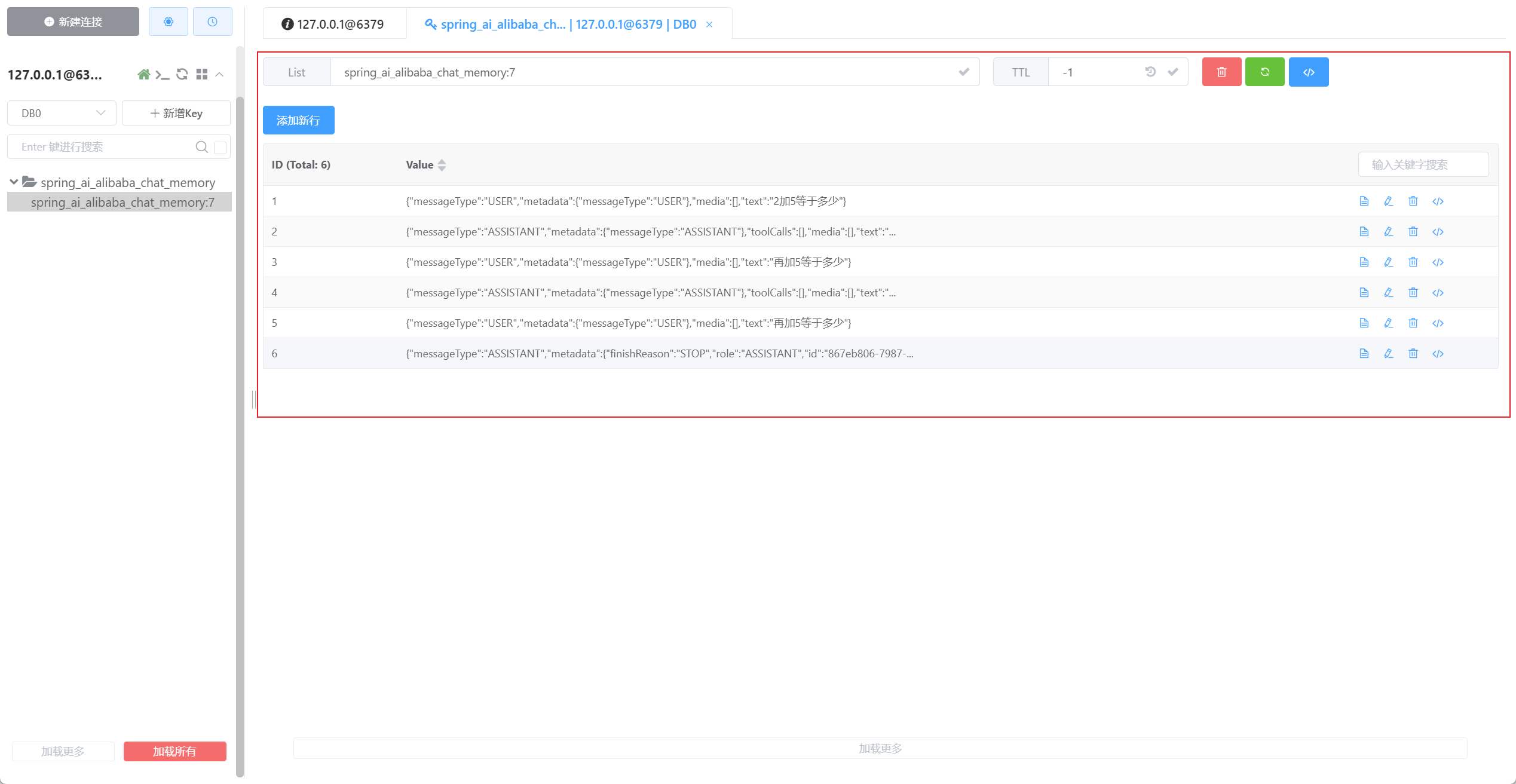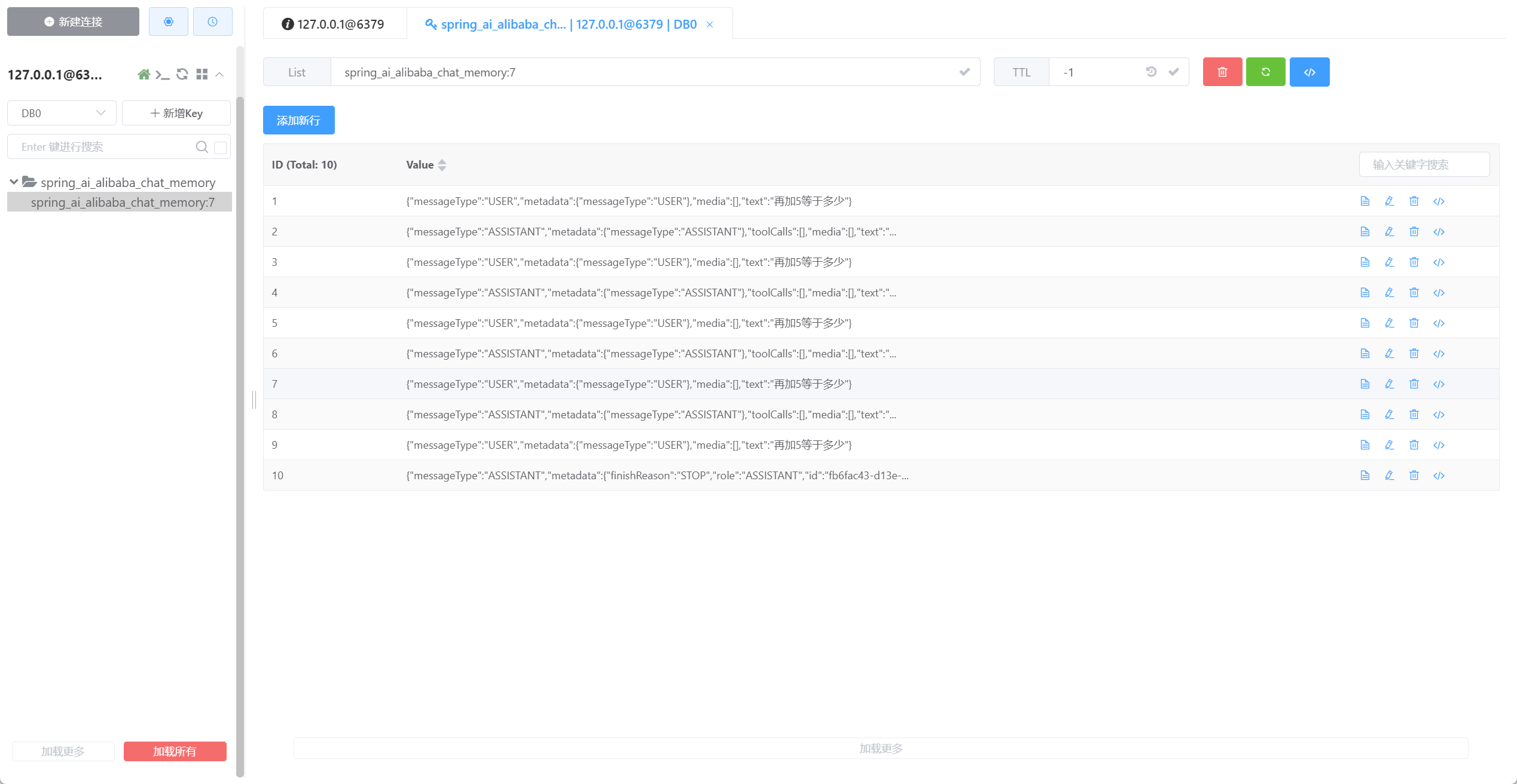 private static final String DEFAULT_KEY_PREFIX = "spring_ai_alibaba_chat_memory:";)和userId共同组成了Redis中的key,value是用户提问的消息内容,是一个list集合