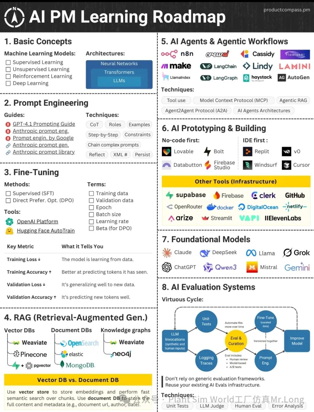 本文提供AI产品经理系统学习路线图,涵盖8大核心领域:基本概念、提示工程、微调技术、RAG检索增强、AI代理与工作流程、原型设计、基础模型及评估系统。AI产品经理需深入理解机器学习技术,掌握从数据收集到模型部署全流程,将AI技术与商业目标结合,有效规划、设计、开发和推广AI产品。