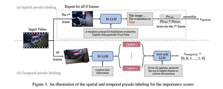 空间伪标签: 对N帧中的每一帧,单独将其与问题输入到一个强大的M-LLM(Qwen2-VL)中,并提问“这张图片对于回答问题是否有用?”。模型生成“True”的概率被用作该帧的空间重要性分数。
