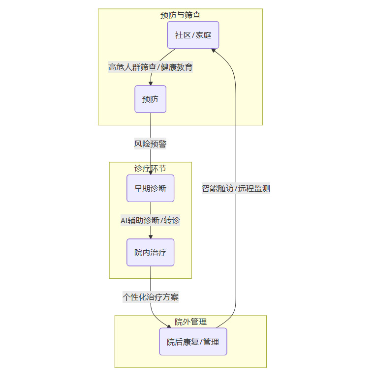 AI赋能的慢病管理,构建了一个覆盖“防、筛、诊、治、康/管”五位一体的全流程服务闭环。它将原本割裂的环节有机地串联起来。