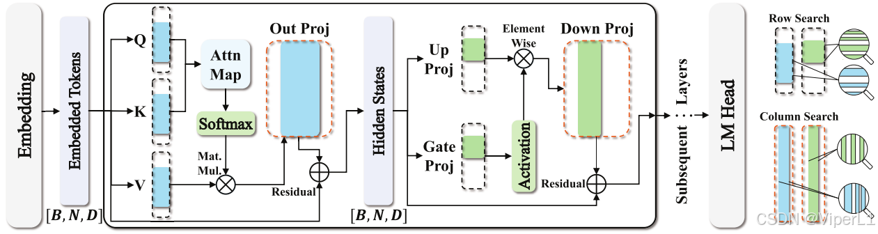 需要注意的是Transformer模块的搜索空间不包含head,同时LLMs的嵌入层和输出层也不会被纳入搜索空间。