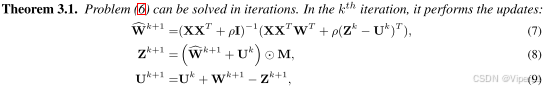 式⑥中,表示修剪后权重的位置,元素1表示修剪后的权重,0表示未修剪后的权重。在这里,我们只根据W中的省略列来改革继承的列,而不是用省略的行来改造行,因为与省略的行相对应的输出总是零,这对于通过修改其他行进行的任何补偿是不可用的。为了解决这一问题,本文出了一种基于乘子交替方向法(ADMM)的解决方案,其定理如下。