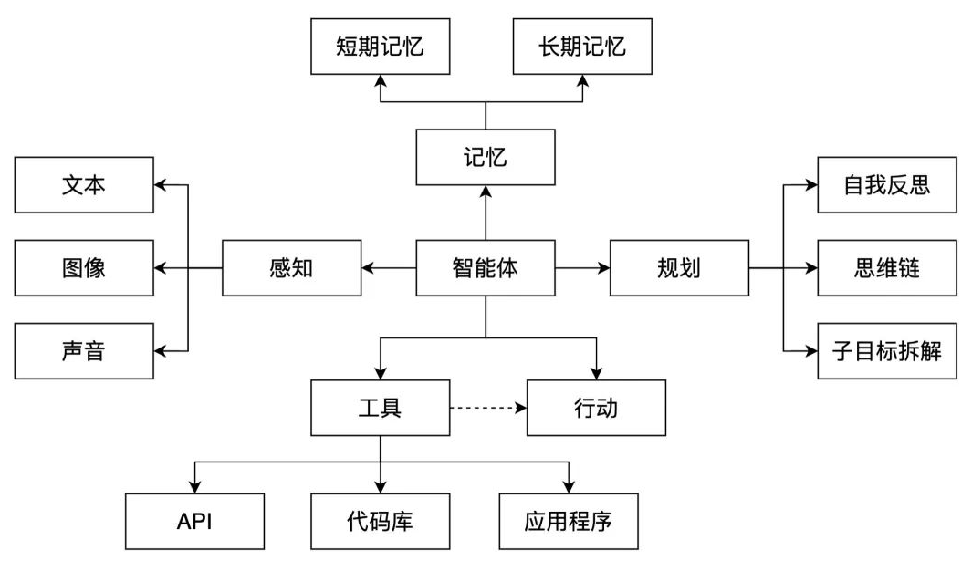 核心能力 | 语言理解、文本生成、逻辑推理 | 感知、规划、记忆、工具使用、行动 |