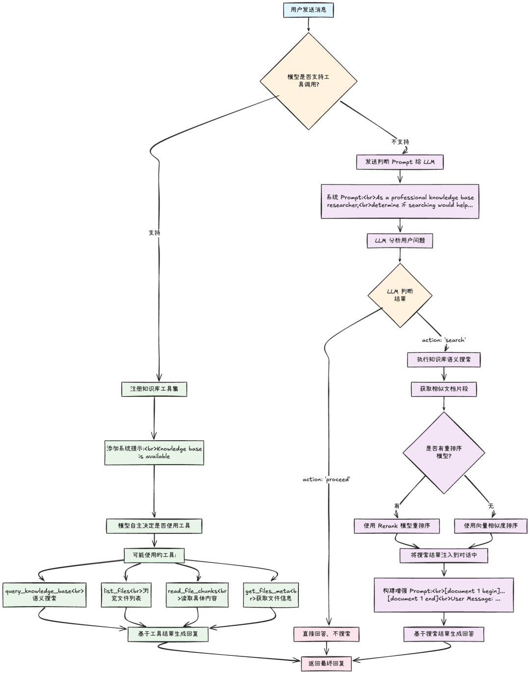 - 预先通过检索排序将知识放到 Prompt 中,然后利用 LLM 生成回复