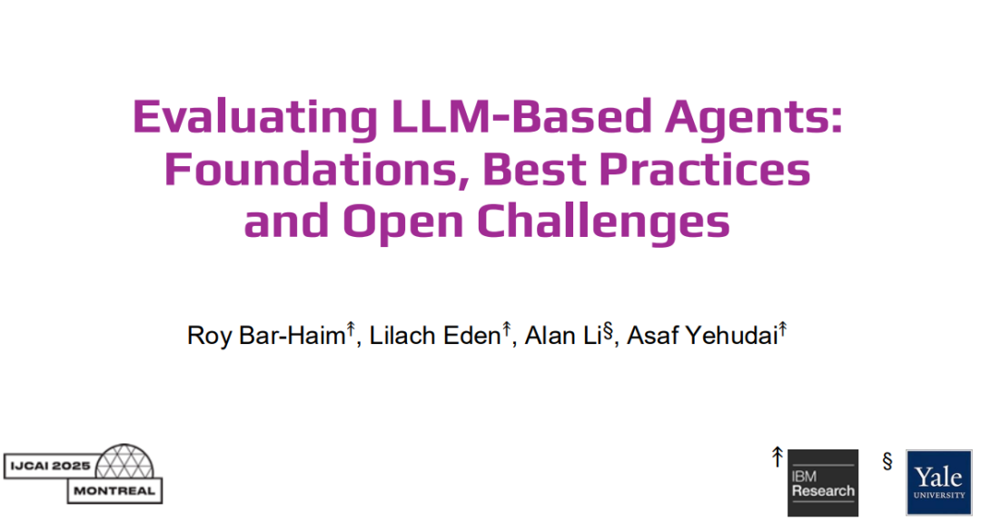 来自今年的**IJCAI(International Joint Conference on Artificial Intelligence)—A类国际学术会议会上,IBM和耶鲁的研究人员给出了《评估基于LLM的智能体:基础、最佳实践与开放挑战》教程。**