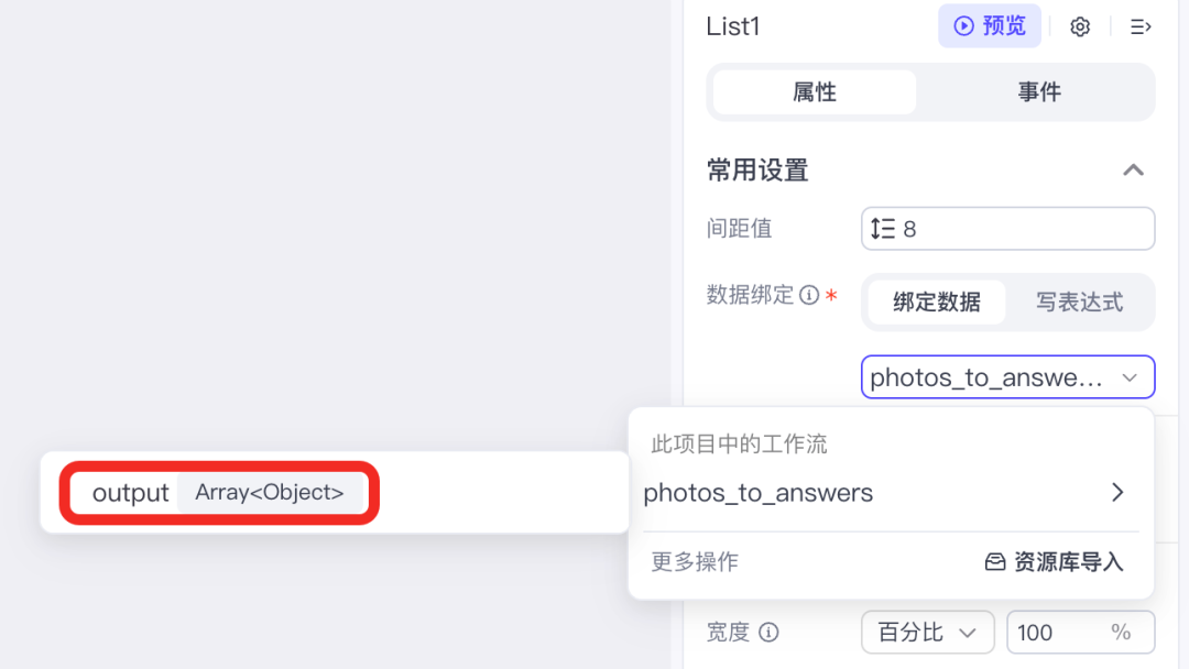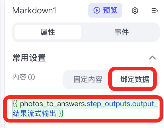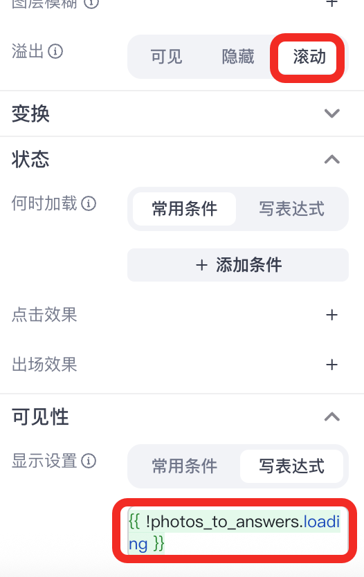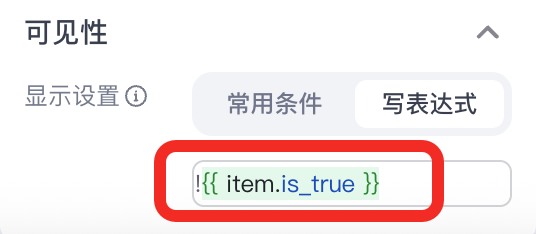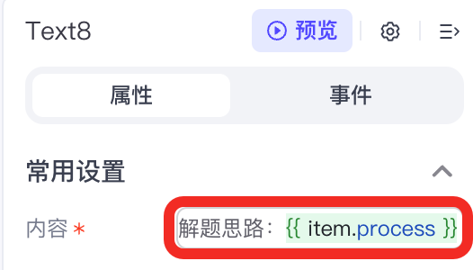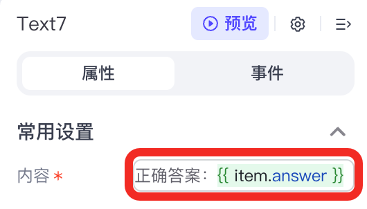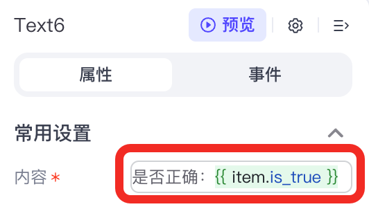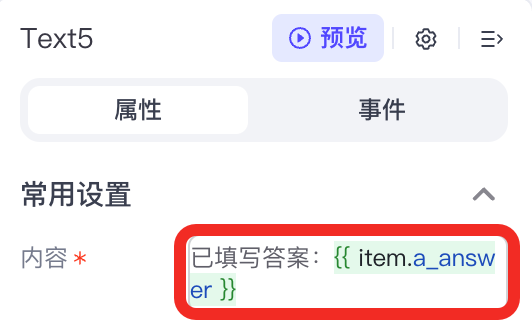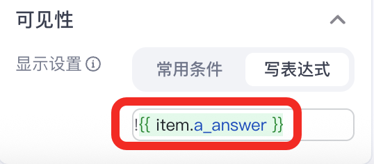 - 主要目的:一条条展示标准化输出结果。如果题目中未填写答案,则大模型对“已填写答案”和“是否正确”输出的结果为空字符串,需要隐藏这两条结果,“可见性”表达式为true时,就隐藏,否则可见。