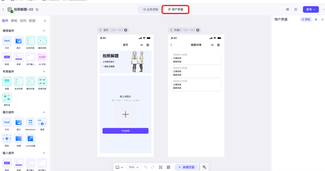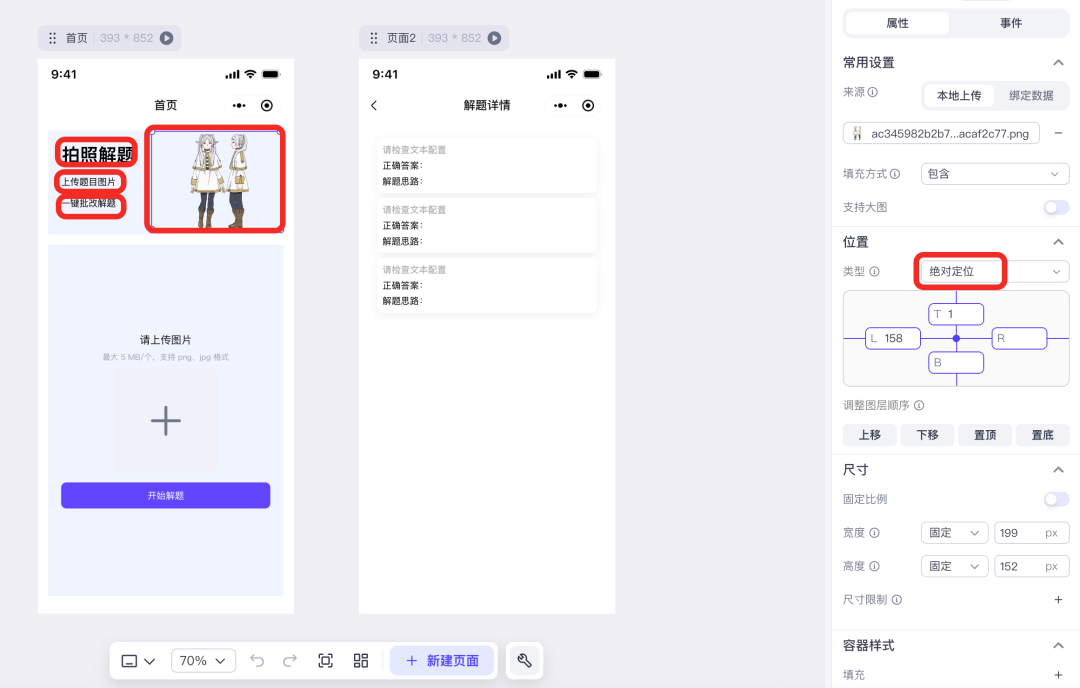 第十四步:页面2——命名为“解题详情”——添加一个容器组件和一个纵向列表组件