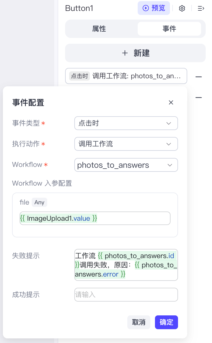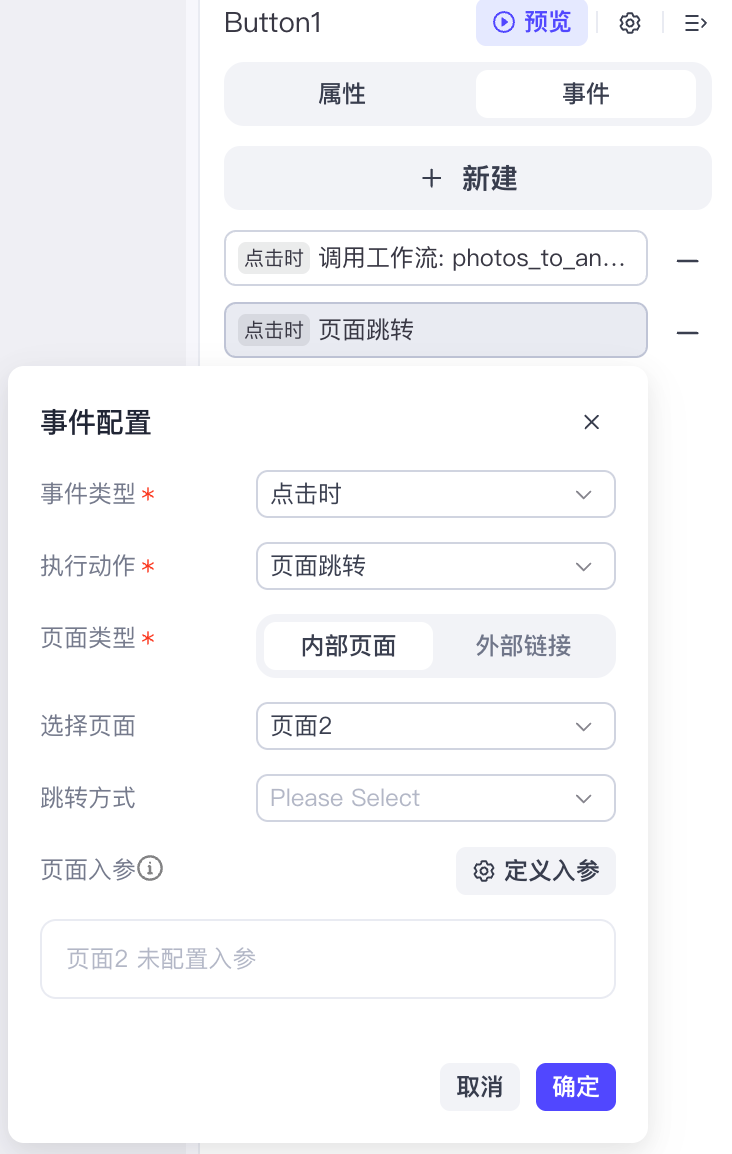 第十三步:单击开始解题按钮——事件——新建两个事件——1、调用工作流,2、页面跳转(要先新建一个页面2)