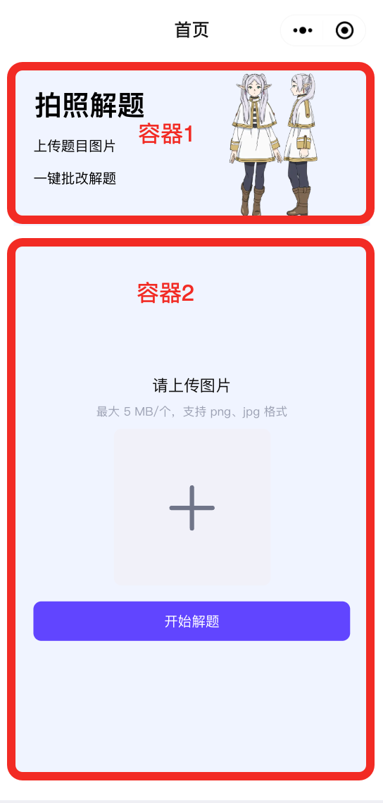 - 主要目的:上面的容器用来装饰,没有实际功能;下面的容器用来人机交互,包括拍照或上传图片和开始解题