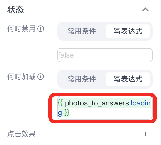 第十二步:第二个容器——添加图片上传组件和按钮组件——按钮组件命名为“开始解题”——按钮组件的状态-何时加载设置为工作流loading时,到时会有一个转圈的加载状态显示