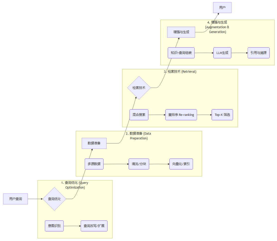 混合搜索(Hybrid Search)、重排序模型(Re-ranker)、查询扩展与重写。 |
