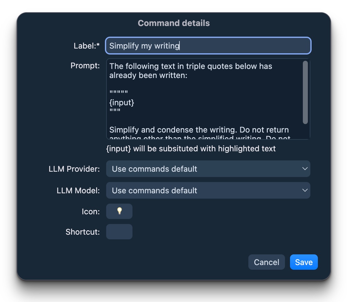 AI 命令是可通过快捷方式访问的快速助手,利用 LLM 来提升您的生产力: