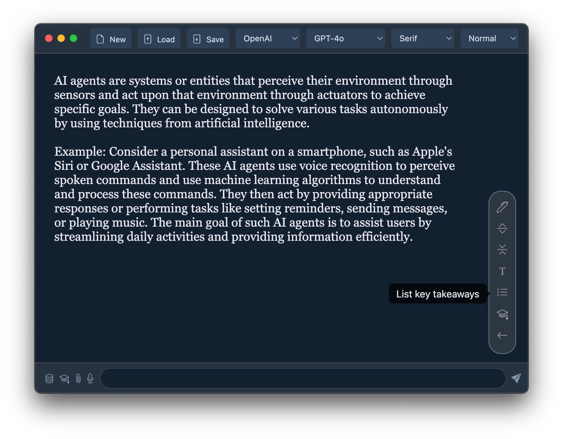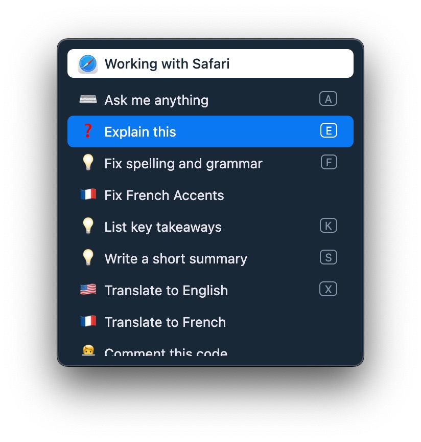 在任何应用程序中选择任何文本 - Hit the AI command shorcut (Alt+Control+Space / ⌃⌥Space)