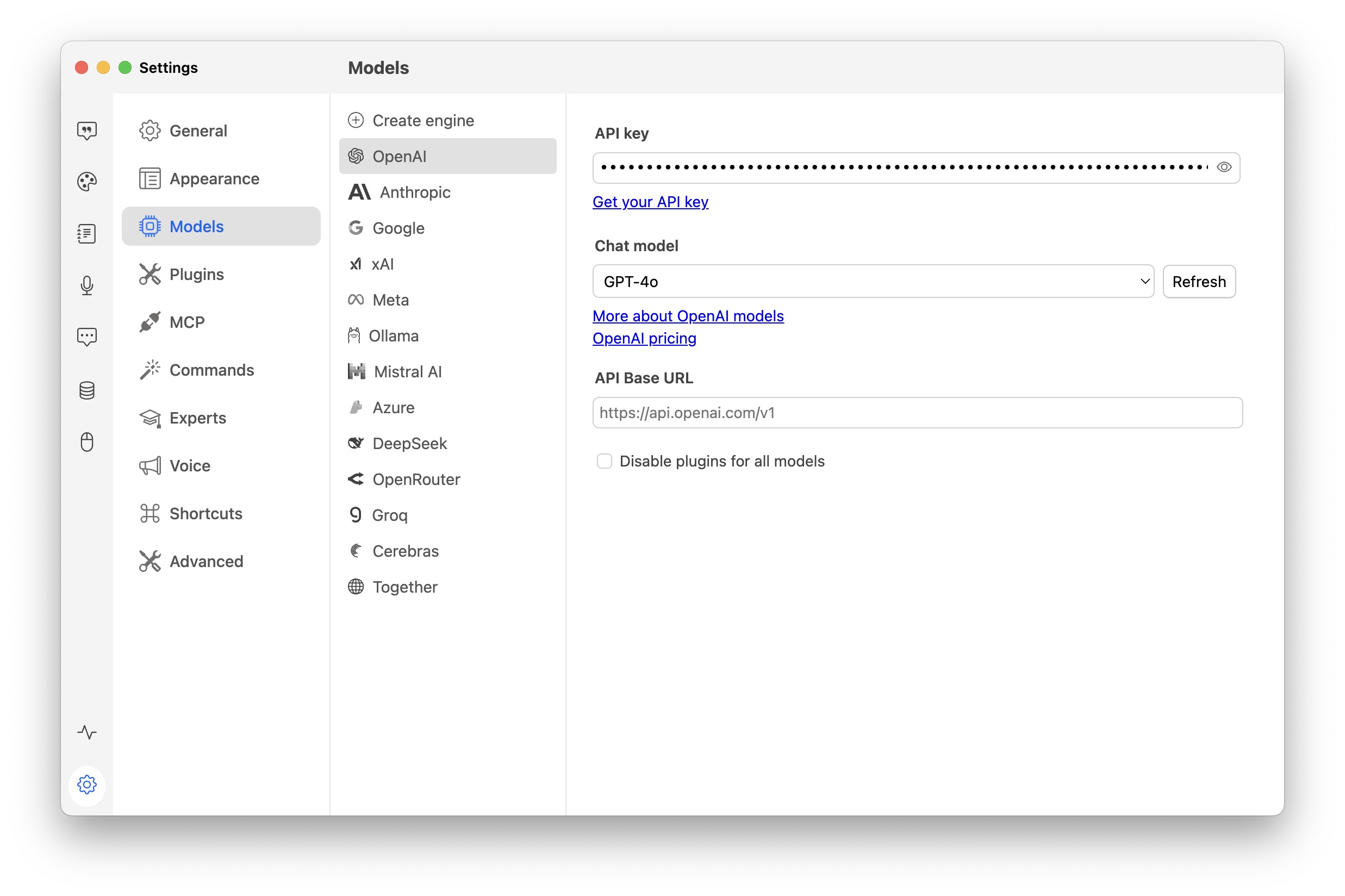 To use OpenAI, Anthropic, Google or Mistral AI models, you need to enter your API key: