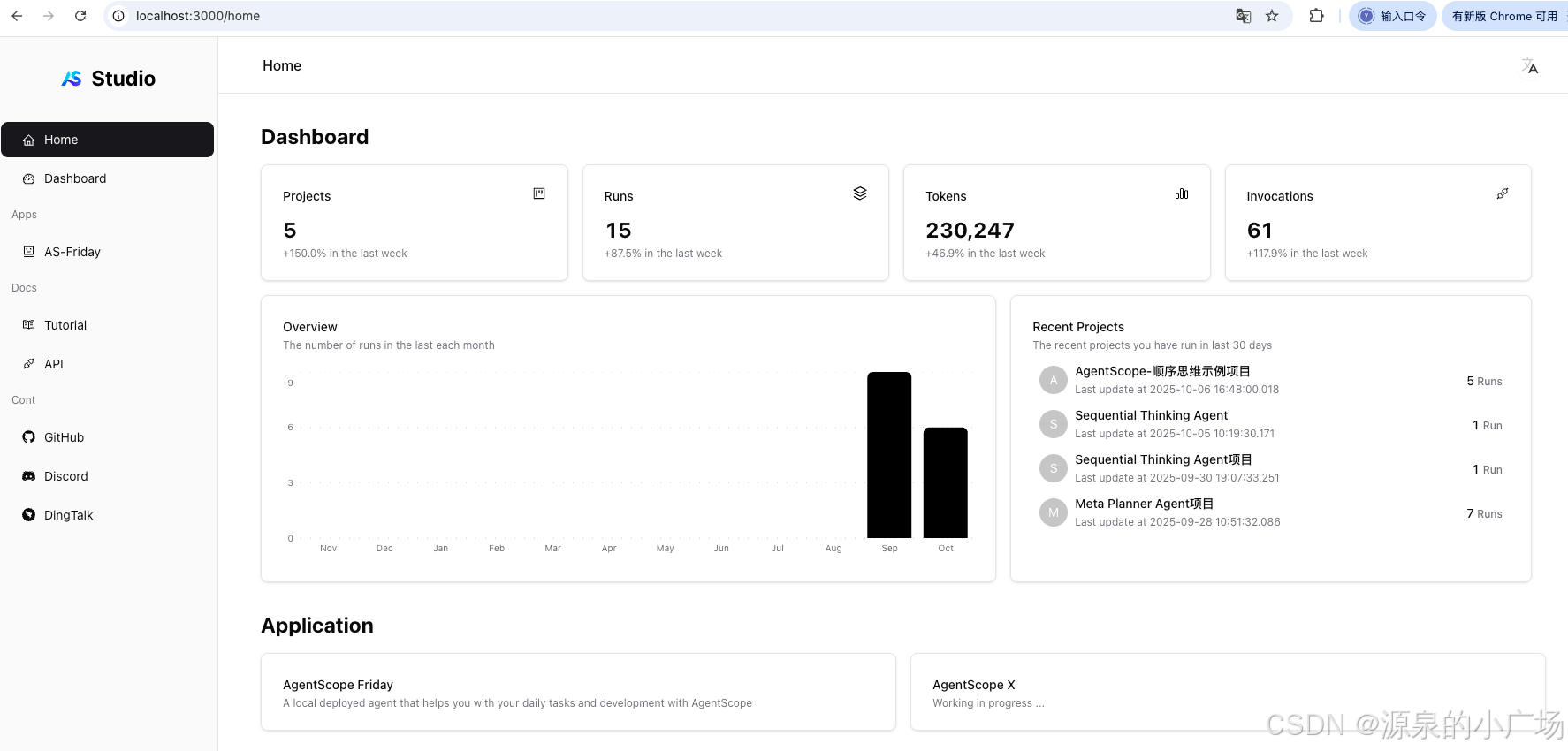 在第2部分,可以从dashboard中看到相应的projects,这个是需要按照下述操作。这里以react agent以及meta_planner_agent两个项目为例来说明,这两个项目位于agentscope/examples中。